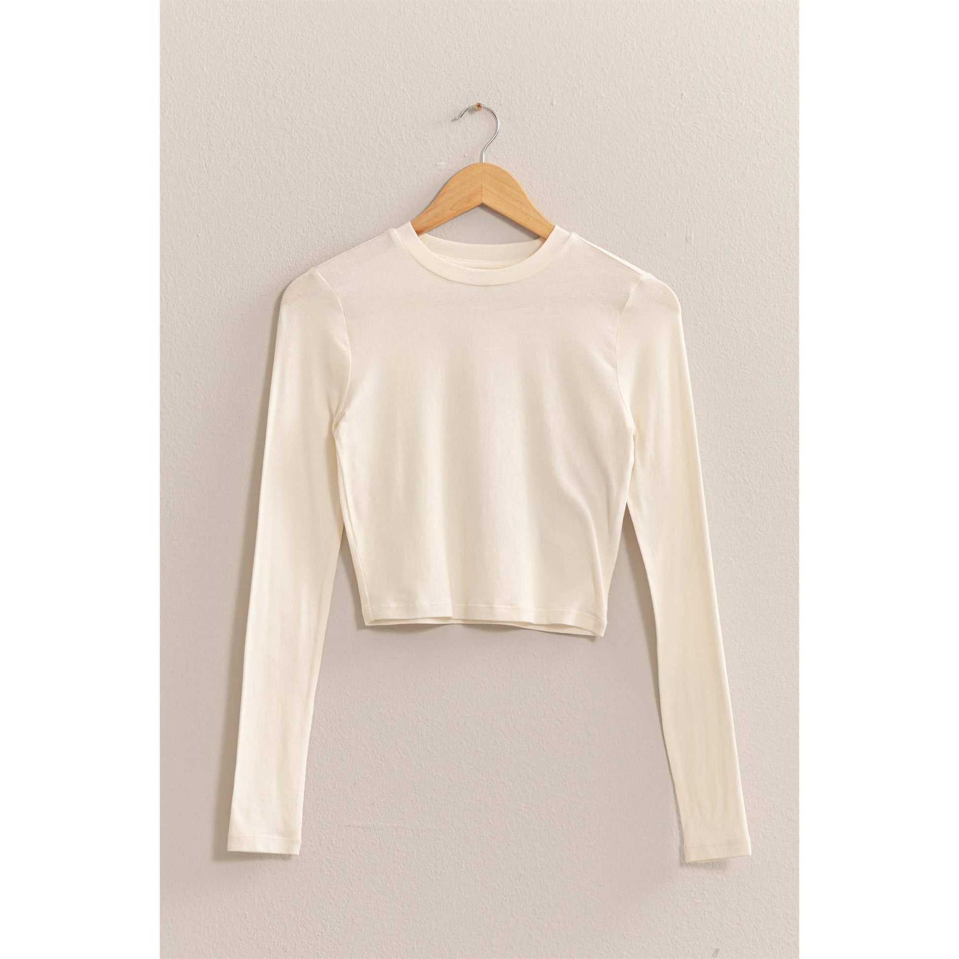 THIS ESSENTIAL CROPPED LONG SLEEVE TEE FEATURES A CLASSIC CREW NECKLINE AND A SLIM FIT. 57% COTTON 38% RAYON 5% SPANDEX IMPORTED.