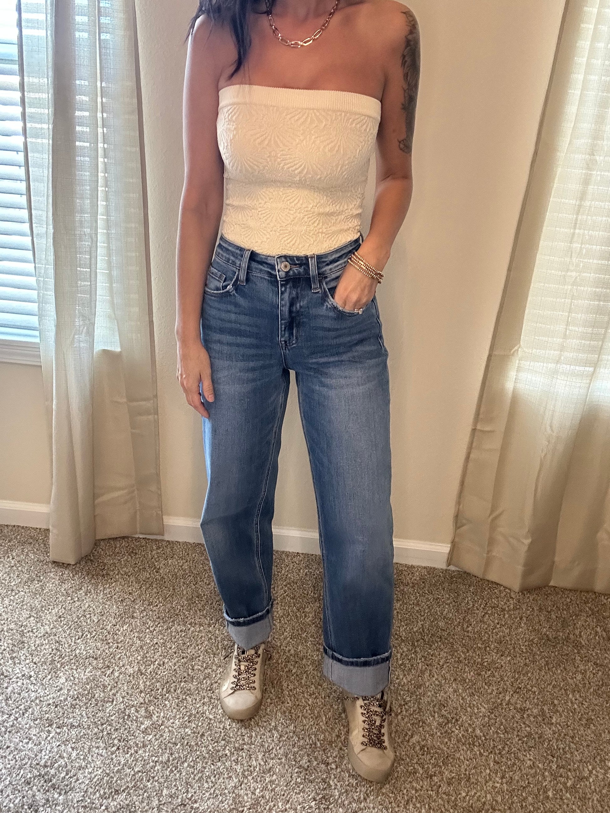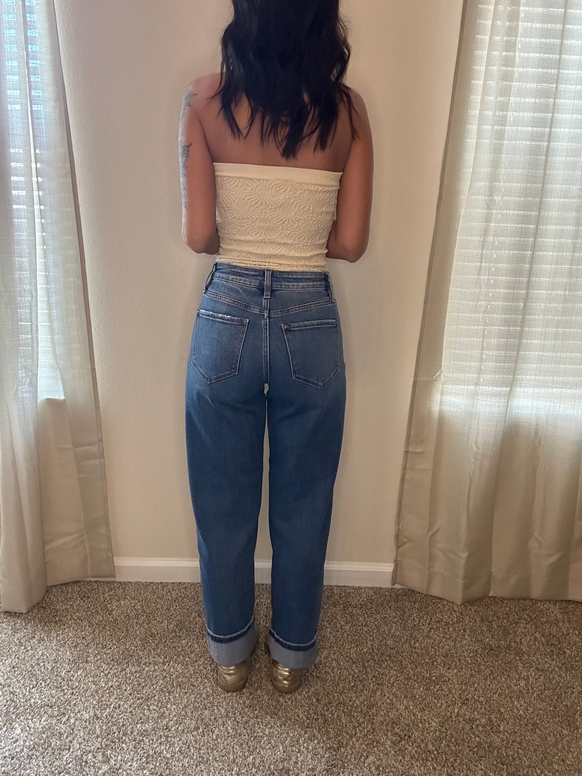 COMFORT STRETCH DENIM, HIGH RISE WAIST, SINGLE CUFF HEM, CROPPED LENGTH, BARREL LEG JEANS